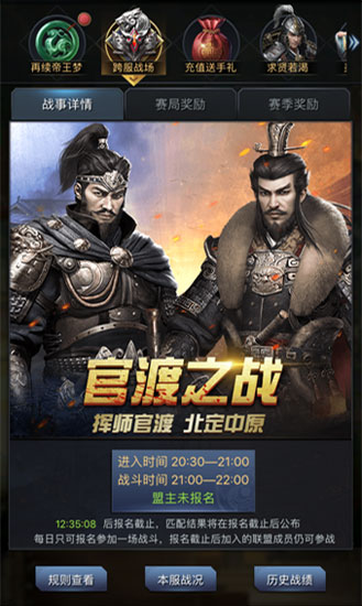 2、大营在进入时是空的,需要玩家从主城调遣士兵跟武将过去(无需等待,瞬间到达,如果有出征/援防部队在外,则无法进入战场);期间战场里大营跟所有战场的建筑此时是免战的且无法出征,21:00之后免战破除,战场正式开始。