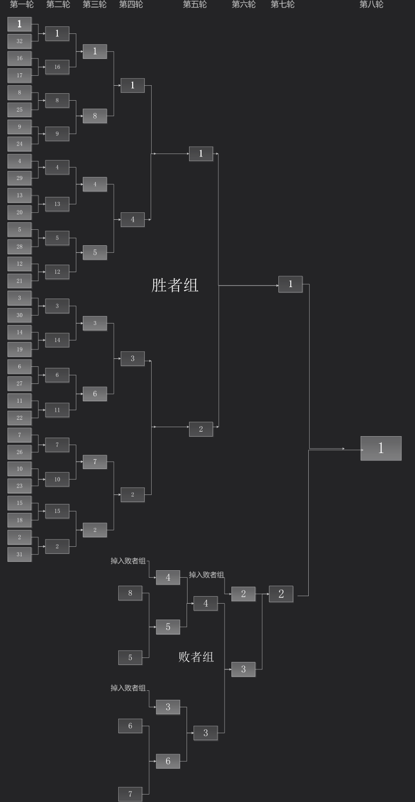 第一轮:1 VS 32, 2 VS 31…… 15 VS 18, 16 VS 17。 共16场比赛。