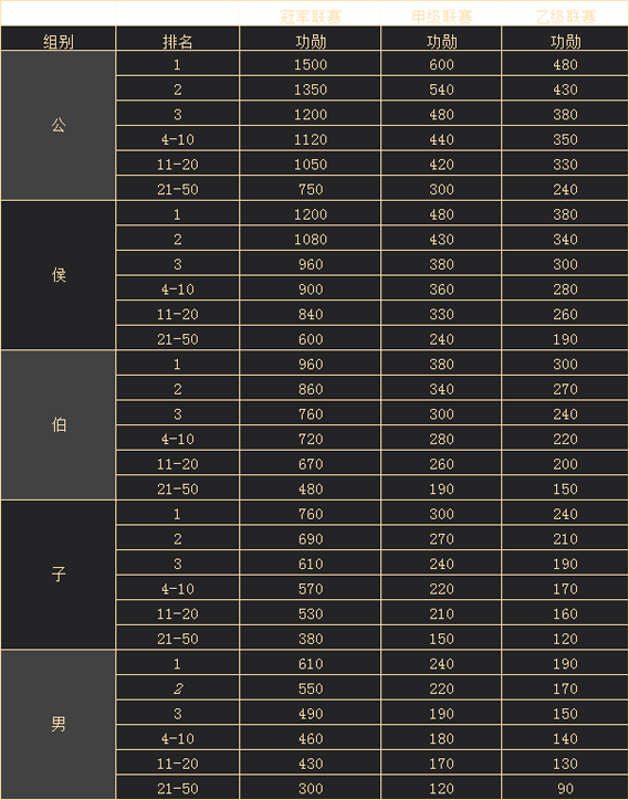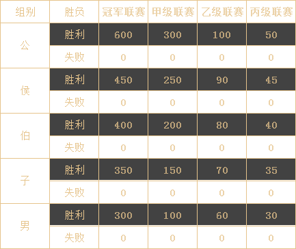 ● 每个段位(公侯伯子男)的联盟有初始胜点,获胜的联盟都会根据该场获得的积分增加胜点,失败则减少胜点,段位越高可获得的胜点越多